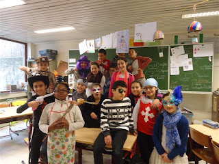 Tijdens het taalthema werkten we rond het boek 'Met Noga en een rugzak'. Hierin gaat Mirre op zoek naar haar oom. Op het einde van het verhaal vindt ze haar oom eindelijk tijdens een verkleedfeest.